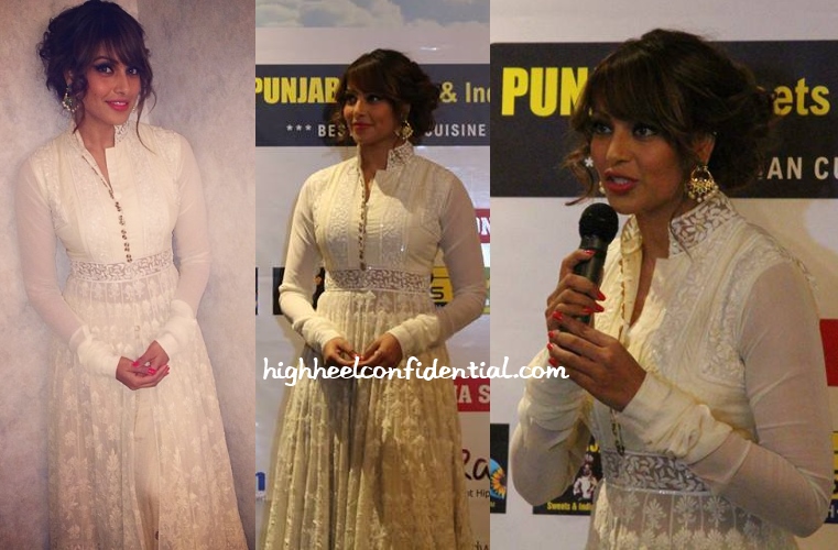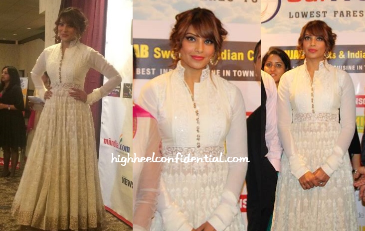 IIFA may be over but Ms. Basu has been busy touring the US making appearances at several cities, one of them being Detroit. For the appearance she went white in a Manish Malhotra floor-length anarkali with her hair worn up in an updo showing off the gold and pearl earrings.