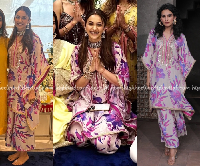 Rakul visited multiple homes for Ganpati darshan prior to the puja at her home and was seen wearing a printed kurta from Label Om. Like the set?