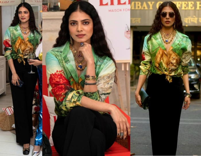 Sabyasachi has launched a new collection of printed silk shirts and the first to be seen wearing it was Malavika to a lunch outing this week. She wore hers with black pants, Gucci pumps and various traditional neckpieces amongst other jewellery.