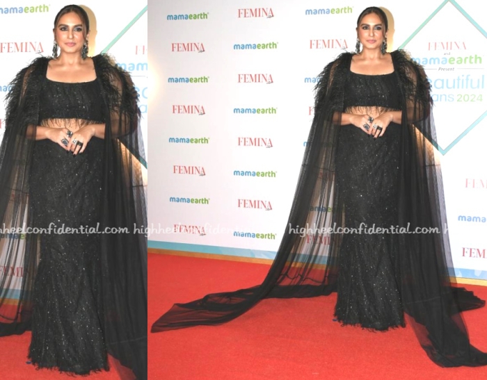 Huma attended an awards event earlier in the week doing all black in a sequin crop top and skirt and a feather embellished cape. The way the feathers were put on the cape made the outfit so very top heavy.