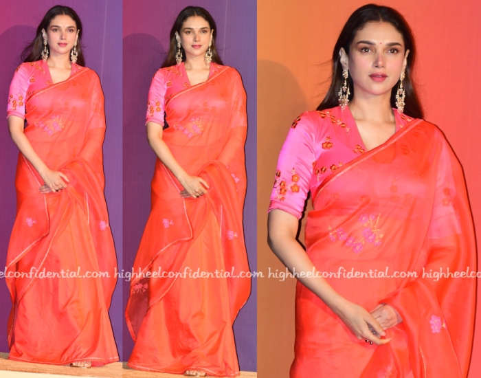 Aditi opted for a floral embroidered sari to wear to the Bulgari party with statement earrings. She looked lovely in it.