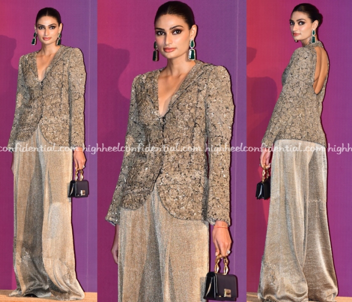 Athiya was seen at the Bvlgari party in a gold-tone jacket and pants set from Anamika Khanna?. Hair pulled back into a sleek bun, her look was finished out with smoky eyes, statement drop earrings and a black top handle bag.