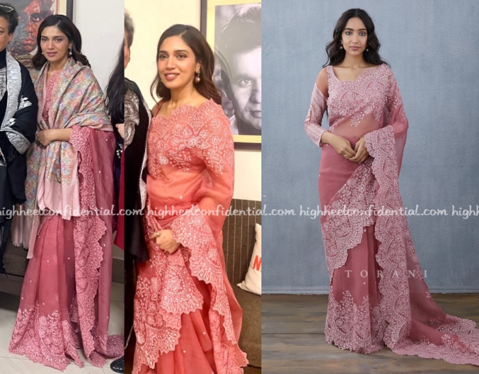 Bhumi attended a special screening of her upcoming movie and was seen wearing a pink sari from Torani with gold earrings. She looked nice in it.
