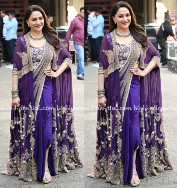Taping for her dance reality series saw Madhuri in a blue Gaurav Gupta sari and a purple Anamika Khanna dhoti skirt set featuring an ornate cape.