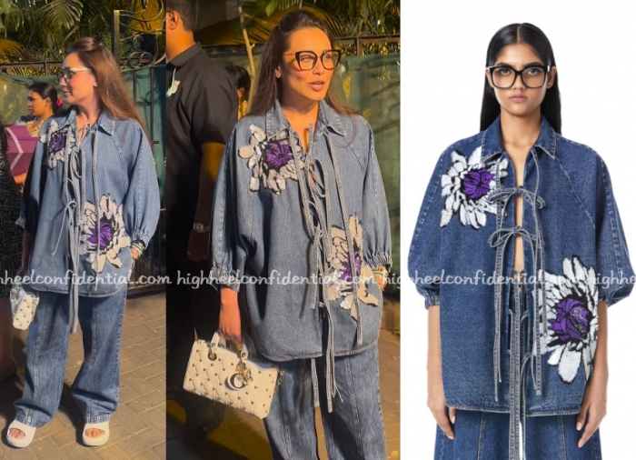At the Johar twins’ birthday party, Rani was spotted wearing a Dhruv Kapoor denim shirt and pants set. Y’all didn’t quite like her in the green similar co-ord set she wore from the label. Like this one? Me, I loved the set. The bag and shoe pick, not at all.