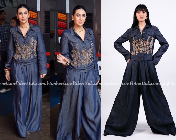 At a taping for a show, Karisma was seen wearing denim jacket and pants set from AK-OK with a set of chunky bangles and gold neckpiece. She looked good in the denims.