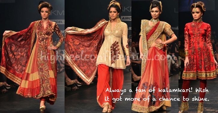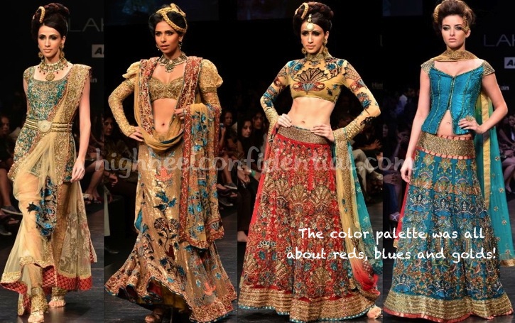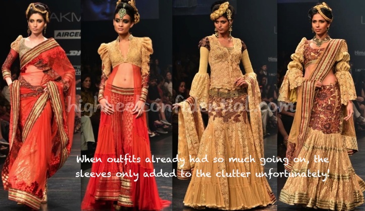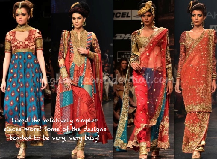 We knew going into the show (virtually, in this case) that there would be tons of paneled backless floor length anarkalis and tiered lehengas with heavy gota work and guess what, we weren’t wrong!