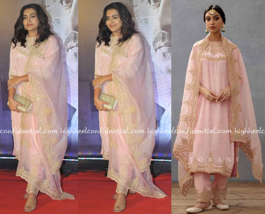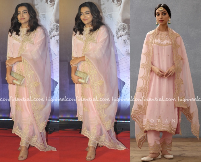At the screening of a movie, Parvathy was seen in a pale pink suit from Torani with tan slides. It’s a pretty suit but wish she’d added some color contrast via the clutch. The look felt too one-toned.