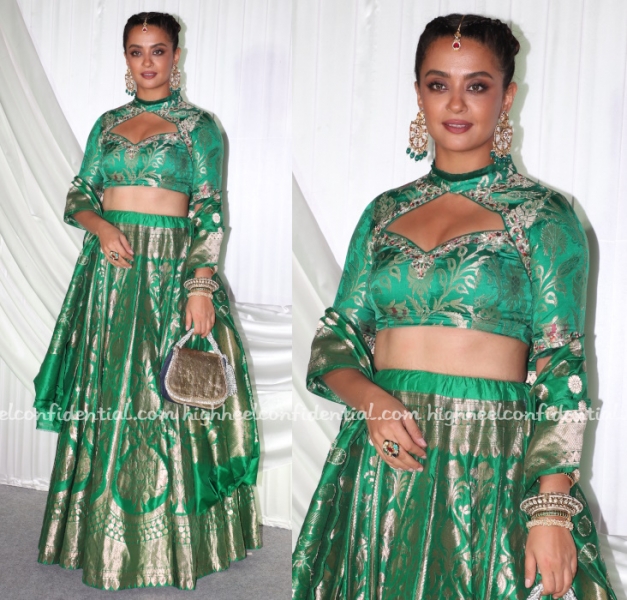 Surveen attended a Diwali party on Wednesday evening wearing a green lehenga and while that skirt was delish, I didn’t care for that choli design. Also, given the slight shade difference, feels like she did a last min mix-match.