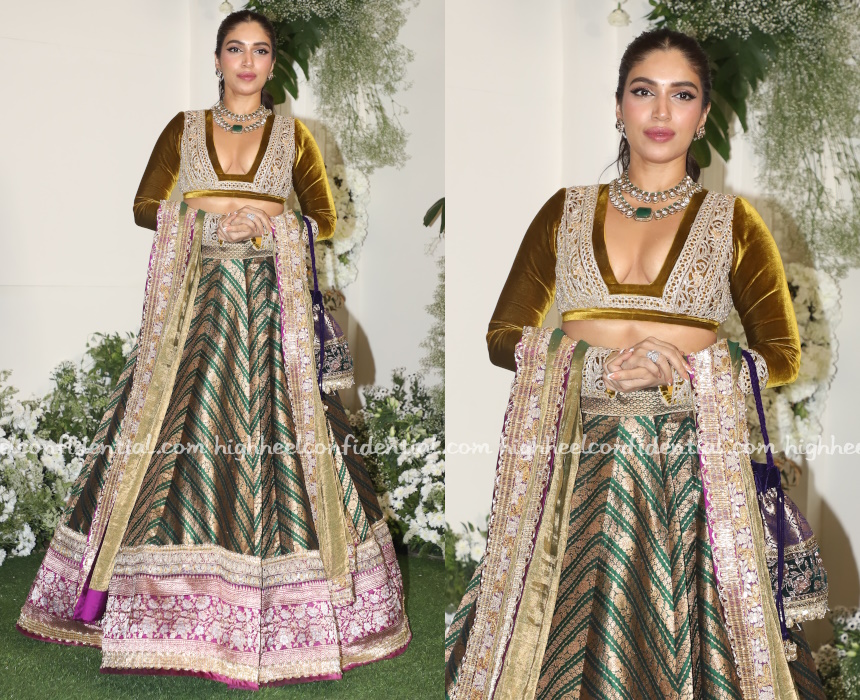 Bhumi opted for one of Manish Malhotra’s lehengas to wear which featured a velvet top and a brocade skirt. The lehenga skirt was just too busy for my taste. Did you like?