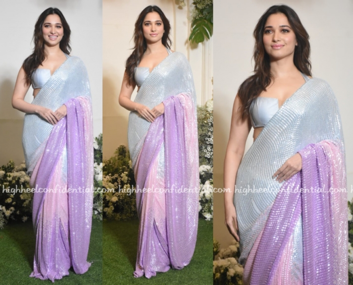 Tamannaah was seen at Manish Malhotra’s Diwali party in one of his ombré sequin saris, this one in a pastel color combo. At first glance, I felt the lip color felt too light but now that am seeing more guests arriving wearing a whole lot more garish designs, I am liking her here. It’s simple and she looked comfortable.