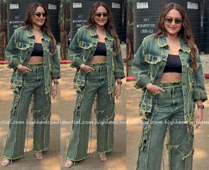 Sonakshi was spotted out and about wearing a denim jacket and pants set from Dhruv Kapoor. Like the tattered set?