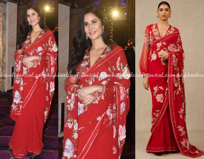 Katrina visited Trissur to attended the Kalyan Jeweller’s Navratri celebrations and was seen wearing a red sari from Tarun Tahiliani. She looked lovely in the sari here even though now that I see the blouse design, don’t quite like it. The blouse that is.