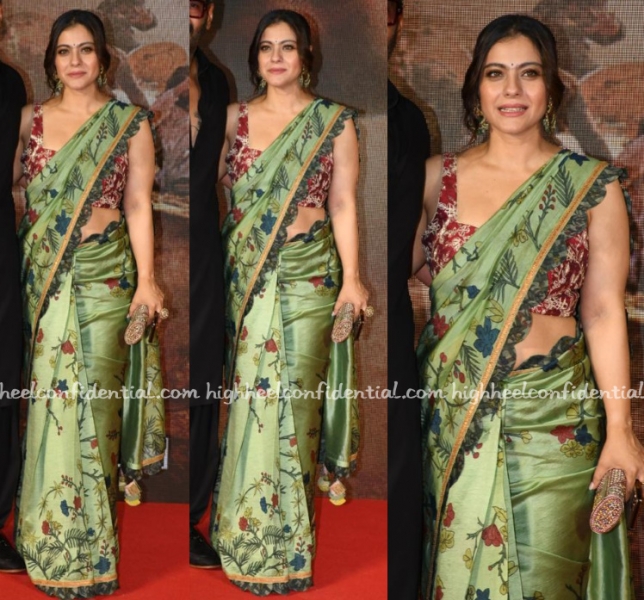 Stepping out again in a sari to a success party was Kajol wearing a kalamkari one from Archana Jaju. She looked good here.