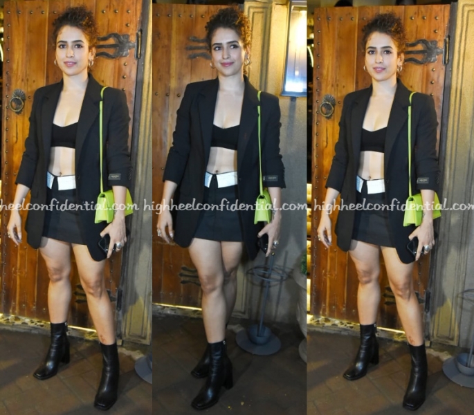 Sanya was spotted out at dinner wearing a blazer with a mini skirt and crop top. If the skirt didn’t have that contrast white faux-fold panels, this outfit wouldn’t look so awkward. Agree? Disagree?