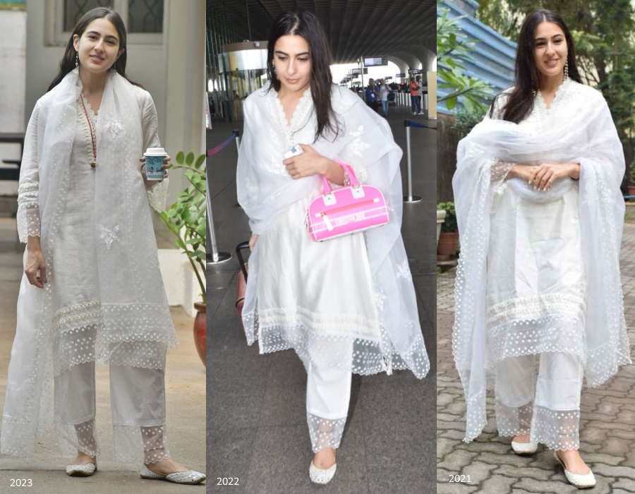 Sara was spotted out and about wearing her white kurta suit from The Loom, one that she has sported quite a few times before. While I love that she rewears the suit, it would be nice if she picked different juttis to pair with.