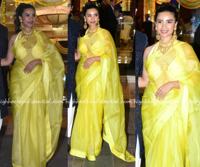 Wearing Anamika Khanna, Sonakshi Sinha attended the Trivedi-Mantena wedding reception on Sunday evening. The sari-pant set was one that we’d also seen on Katrina back in 2016 but minus the cape.