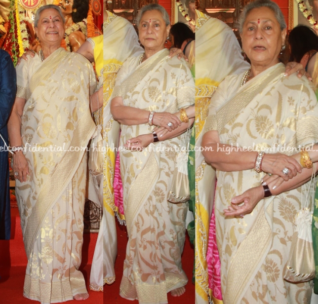 Twinkle attended Durga Puja celebrations on Tuesday evening wearing a green sari from Raw Mango paired with chaand bali style earrings. She looked lovely in it.