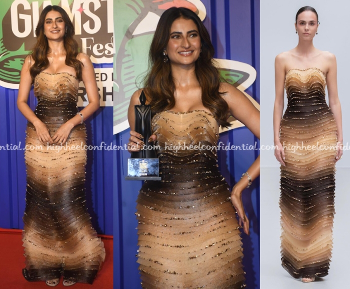 Palak attended two events on Sunday evening wearing a strapless gown from Phan Huy. One of the event was was hosted by a film festival which is probably why she picked this formal gown to wear to it. Having said that, while I like the gown’s unusual color, don’t like the way it falls waist down.