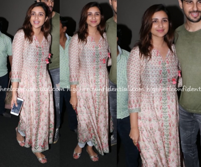While out and about attending meetings, Parineeti was spotted doing desi in a printed Anita Dongre suit and printed jootis. Like her off-duty style?