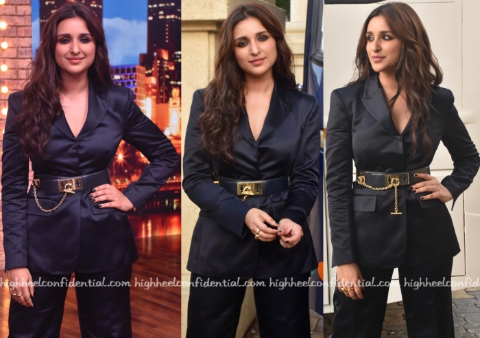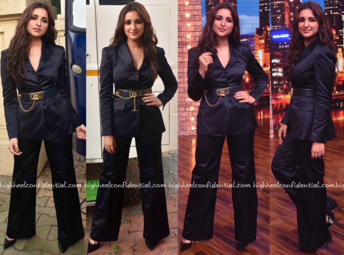 Parineeti suited up in an all black look in an H&M suit for an appearance on a television game show. Though she looked nice overall, the suit itself didn’t earn any points from us. Between the puckering and excessive creasing owing to its fabric, it didn’t come off looking as sharp as it should have. Bit of a miss this!