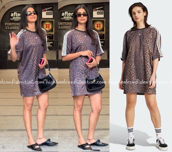 Pooja was spotted out and about wearing a leopard print t-shirt dress from Adidas with a Prada bag and black flats. The bag and tee were fine but those mule flats looked awkward. Just me feeling that way?