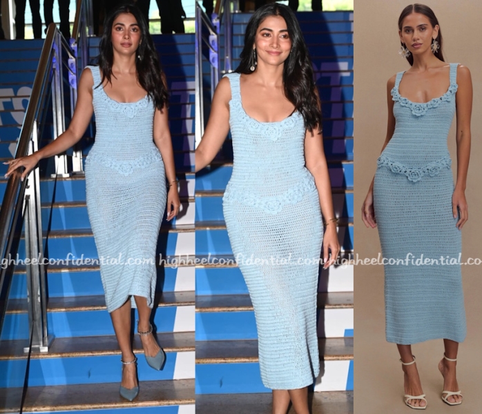 Pooja attended the trailer unveiling of her upcoming movie wearing a crochet dress from Meshki paired with blue ankle-strap sandals. I see this dress as more suitable for a poolside/beachside event especially it being semi-sheer. Agree? Disagree?