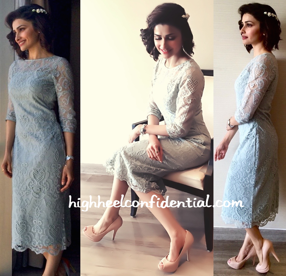 Wearing a Marquee Limited Edition dress, Prachi attended an event in Ahmedabad. Playing off the pastel, lace overlay dress, Prachi finished out the look with a flower wreath in her hair and nude pumps. Going as she was for a rather soft look, the chunky Rock n Republic pumps stood out like a sore thumb. A more delicate pair of sandals would’ve served her better!