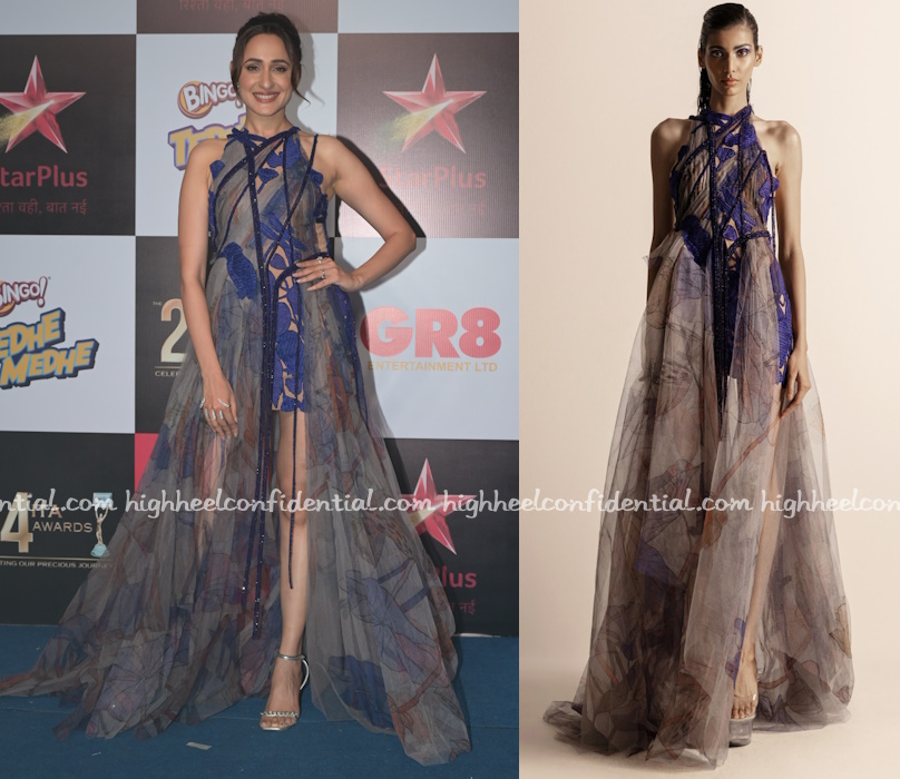 At an awards event, Pragya was seen in a backless dress from Abhishek Sharma featuring additional printed overlay material to give it a gown effect. It was an interesting dress and she wore it well. Catch the model pic inside.