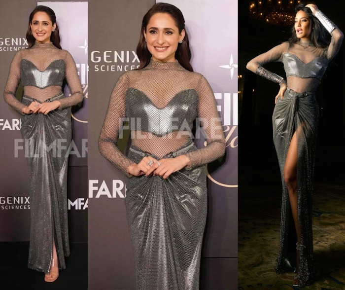 Pragya was seen at a glamour and style awards event wearing silver gown from Shantanu and Nikhil. She lost me at A) the lamé and B) that mesh.