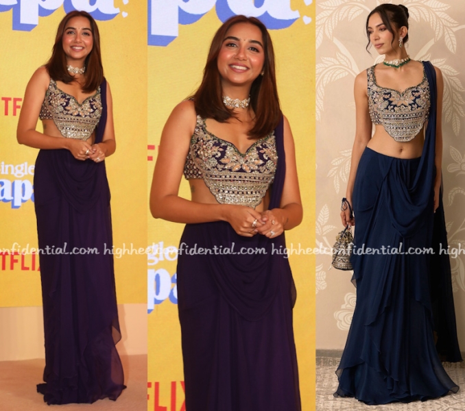 Prajakta attended the trailer launch of her upcoming series wearing a ruffle stitched sari from Ridhi Mehra featuring an ornate embroidered choli top. A choker and a tiny bindi finished out her look. She looked nice.