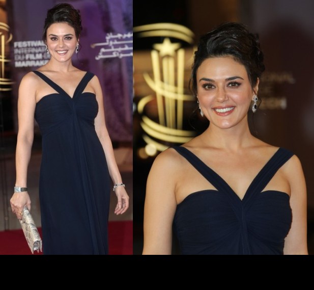 Preity Zinta attended the closing night of Marrakech International Film Festival wearing a black ruched Gauri and Nainika gown paired with a snakeprint white clutch. After the fab appearance in Gucci in Venice, this black number felt rather dull on Preity. We are totally underwhelmed.