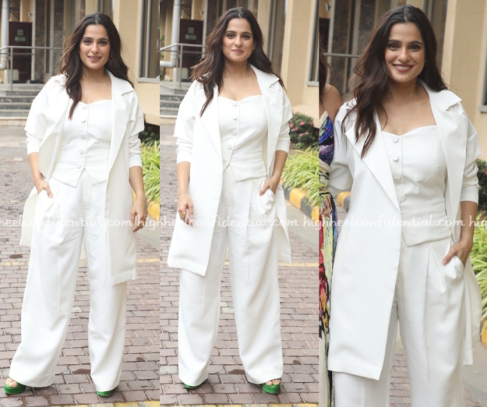 Priya attended promotions for her series wearing a white jacket, vest and pants set but giving the look a pop via green platform sandals. I quite liked the simplicity of this outfit. You?