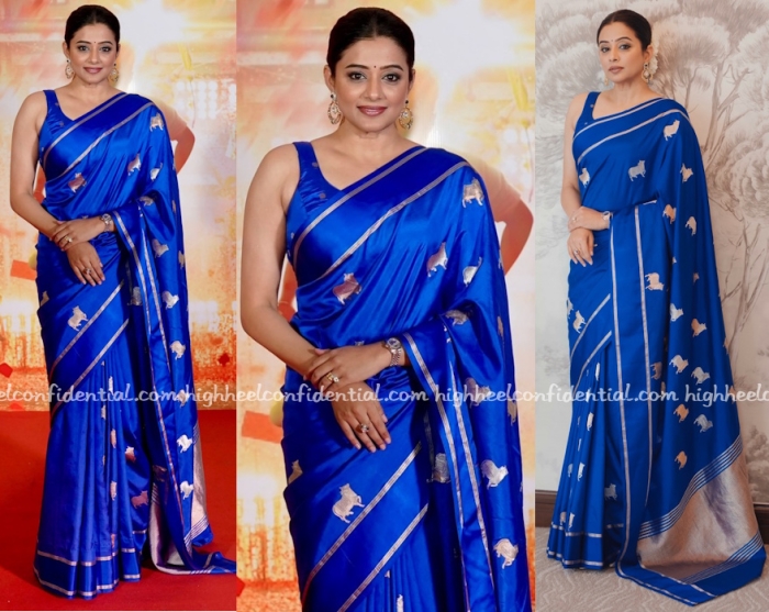 Priya was seen in a cobalt blue sari from Sumangal Banaras at the audio launch of her movie in Malaysia which she paired with drop earrings and her hair in a bun complete with gajra.