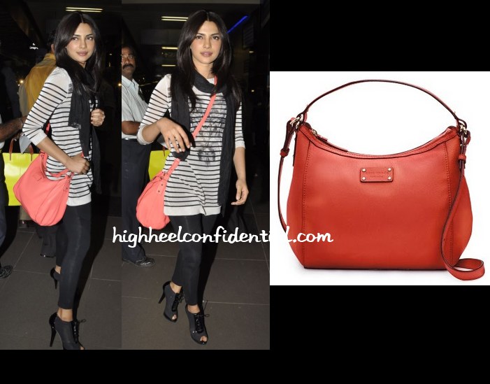On her way to Dubai, Priyanka was spotted at the airport doing black and white with a pop of color via a Kate Spade Gladys bag.