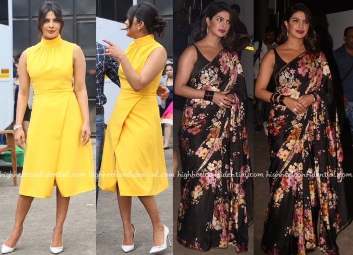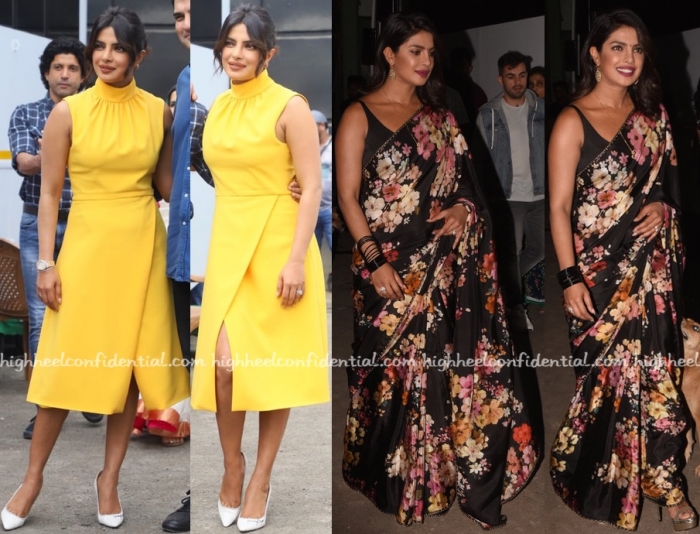 While doing the media rounds in Mumbai to promote her movie, Priyanka was first photographed in a cheery Christian Siriano dress and later, a floral Sabyasachi sari.