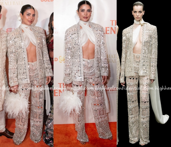 Priyanka attended a Diwali party in NYC last week wearing a look from Zuhair Murad‘s Spring 2025 collection. While she (and her stylist) got points with the Rajasthani mirrorwork inspired pantsuit pick, they lost a whole lot more by wearing that scarf top as a pseudo top way with that random maang tikka.