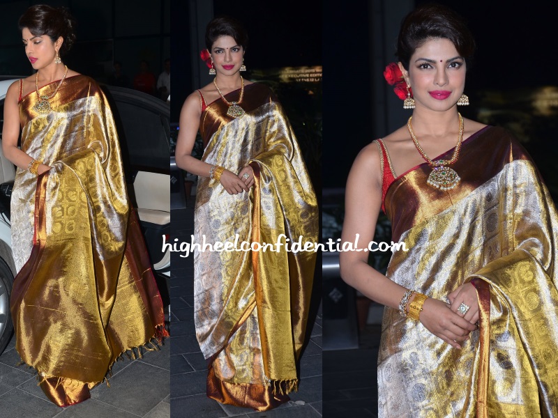 What an absolutely gorgeous saree! Wish PC had worn a better blouse though – this one is rather ridiculous with such a classy sari.