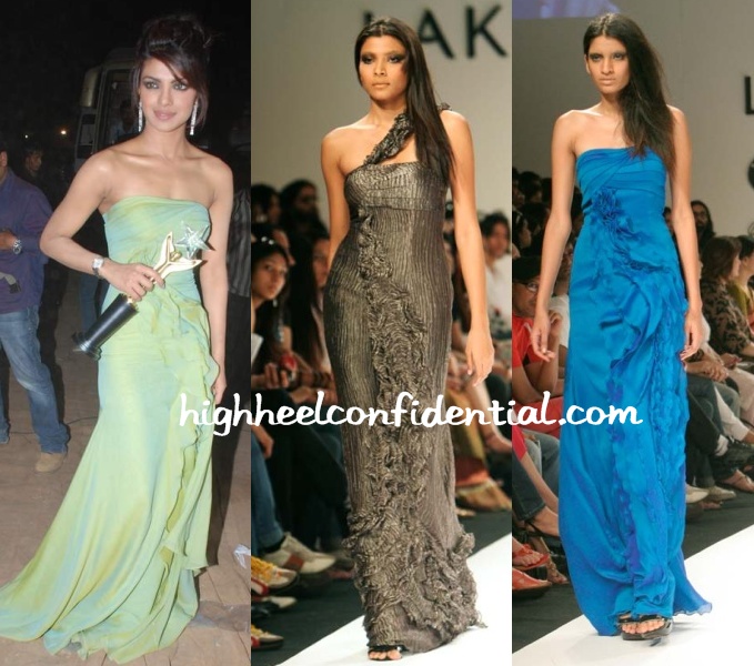 Just like Kareena’s white sari (see here) made the runway after she wore it, so did this gown of Priyanka’s by Swapnil Shinde. The designer presented another in blue and a variation in metallic grey.
