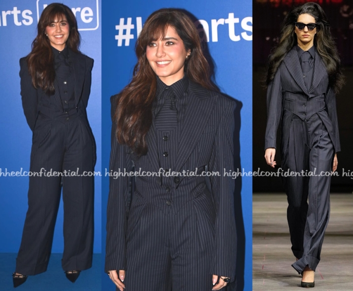 Raashi attended the trailer unveiling of her upcoming series wearing an Helen Anthony Fall 2025 pinstripe look. At first glance, the outfit did look striking on her. But, the more I look at the details, damn there is a lot going on between the cropped vest, tie, shirt and butler jacket.