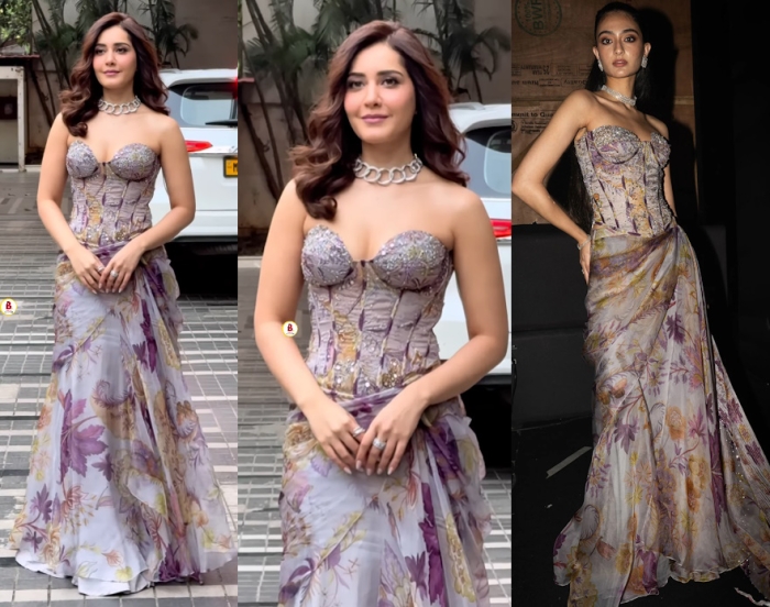 At promotions of her movie, Raashi was seen in a printed strapless corset lehenga from Mahima Mahajan paired with a chain choker. I have corset fatigue at this point and wasn’t digging this design.