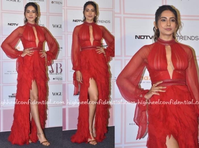 Rakul attended the Vogue Beauty Awards wearing a red ruffled gown from Aednevik, pairing it with gold ankle-strap sandals and a wispy ponytail. I wasn’t blown away but she looked nice nevertheless.
