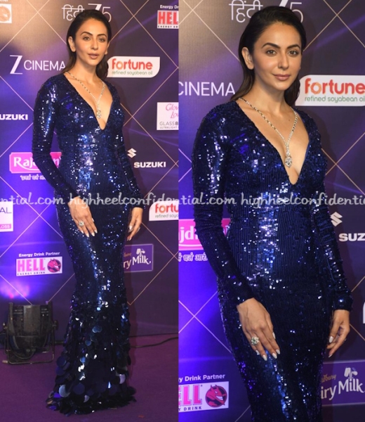 Rakul attended the Zee Cine awards wearing a sequin and pailette gown from AFEW Rahul Mishra featuring a plunging neckline. The color of the gown was striking but I wasn’t won over by this. Maybe its that neckline, the hair. None of it is working.