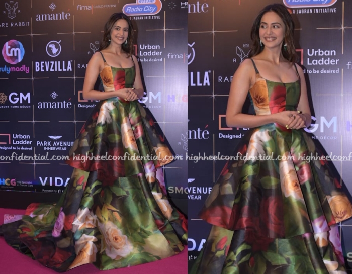 Rakul attended an awards event Thursday evening wearing a floral print gown from Gauri and Nainika. When I look at this gown, it feels like it should’ve just stayed as a frock dress and ended at the first layer. The decision to add another layer under to make it a gown wasn’t really working for me. Bottom part felt too overwhelming and fabric heavy.