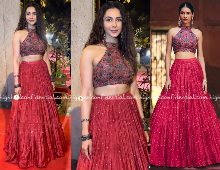 Rakul was spotted at a Diwali party in asjrakh crop top and bandhini skirt from Label Anushree with german silver jewellery. She looked nice but after seeing all the Diwali outfits this week, I have been quite underwhelmed by all the outings.