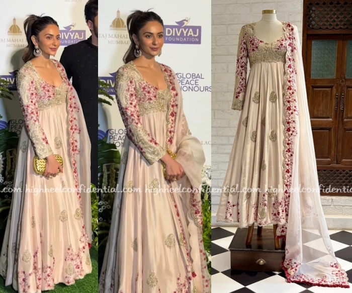 Rakul attended an awards event on Saturday evening wearing a floor-length anarkali from Mrunalini Rao paired with her gold Bottega Veneta clutch. Me thinks, a silver clutch would’ve worked better here.