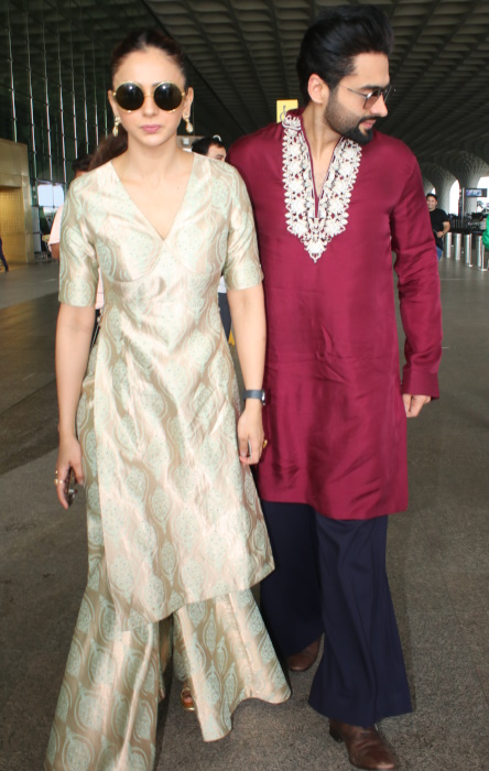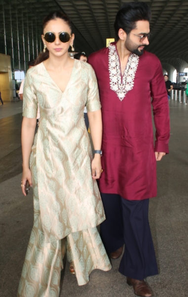 Rakul travelled out of Mumbai on Tuesday morning wearing a Raw Mango kurta sharara set. This one felt incomplete to me without the dupatta. Am guessing they had a an event to attended at a destination and lack of time to change meant they had to wear formals through out.