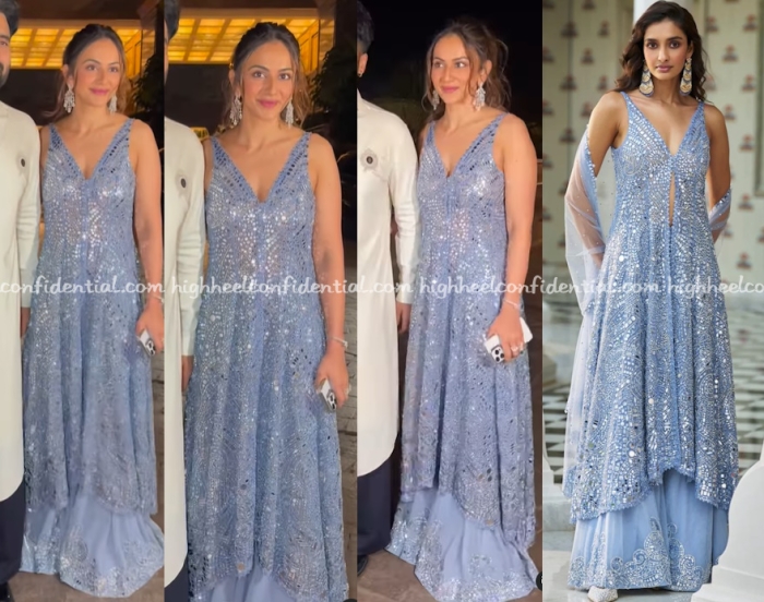 Rakul attended a wedding on Monday wearing a blue sharara suit from Seema Gujral featuring mirror work. She chose to skip the dupatta here. Like what you see?