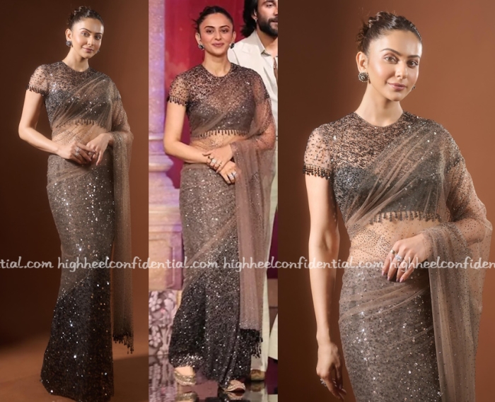 Rakul visited the sets of a reality TV show to promote her movie and was seen in a cocoa-colored sequin sari from Tarun Tahiliani paired with studs and juttis. She looked nice in it.