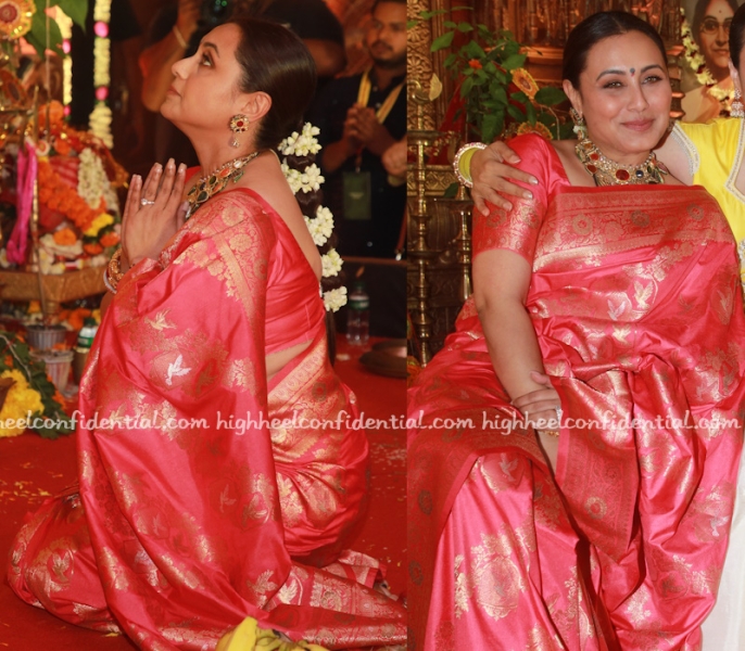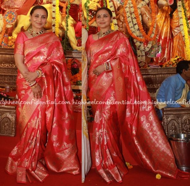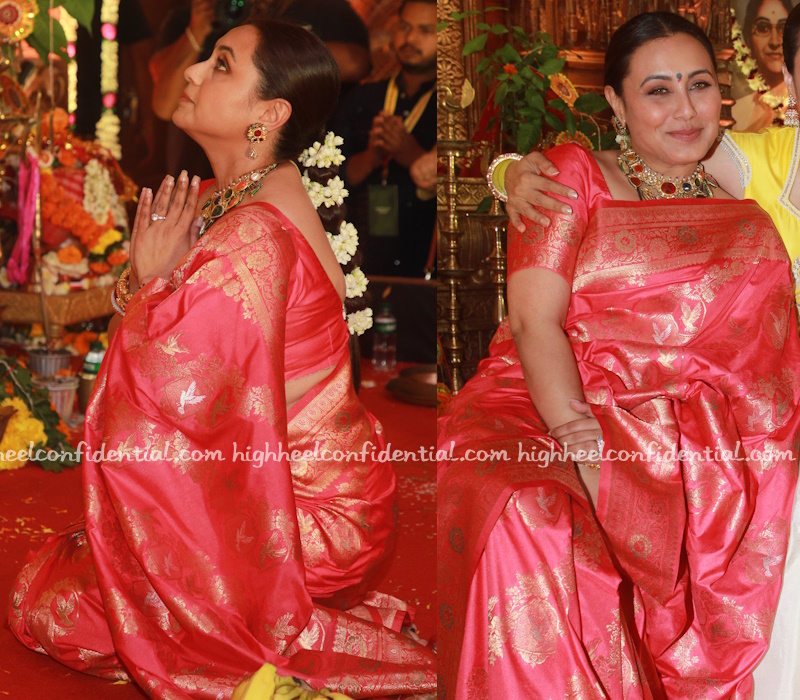 Rani attended Durga Puja celebrations on Monda wearing a red benarasi sari with a navratna neckpiece and mogra tied around her braid.